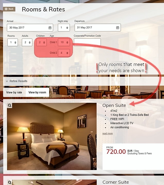 If the booking engine is reached via a different journey through the website, it still looks to be a natural part of the very same Home page. The front page of the booking calendar clearly shows availability and the Best Available Rate for each day. Query available dates for one adult and the returned information will contain the available rooms and rates available for the entire stay for one adult. With adult and child information, the resulting rates and room type information will relate only to the family requirements. No more searching for child rates or the proverbial request to “contact the hotel” for child rates.
